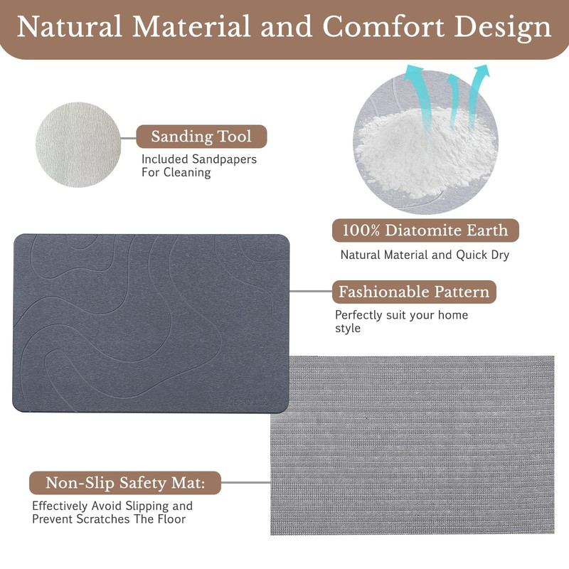 - 【Versatile Use】With fashionable and simple design style, 3 patterns to choose (curve, wavy, mable), the natural stone bath mat is designed to be used in a wide range of occasions, making it a versatile addition to your home. Whether it's in the bathroom, kitchen, living room, swimming pools, or for pet feeding, this diatomaceous mat provides comfort and convenience. It enhances your home life by offering a comfortable surface