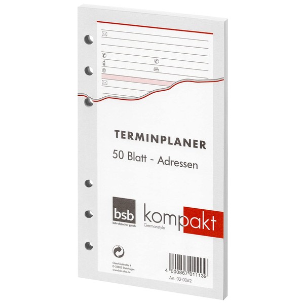 BSB 02-0062 Replacement Insert Addresses Approx. A6 50 Sheets for Compact Diary