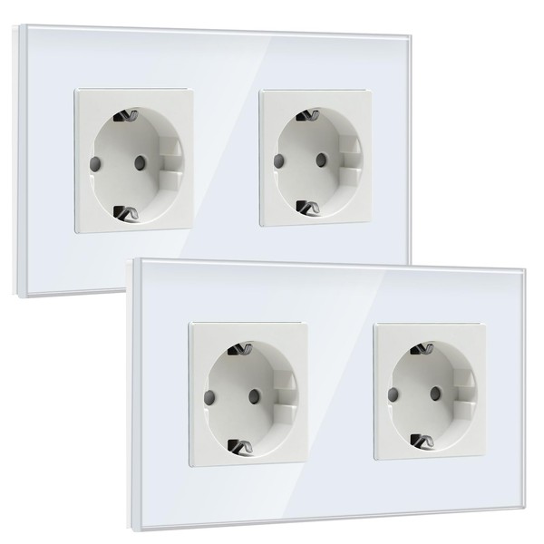 BSEED Schuko Socket, 2-Way Flush-Mounted Socket, Crystal Glass Wall Socket, 16 A Double Earthing Contact Socket, 157 mm, Pack of 2, White