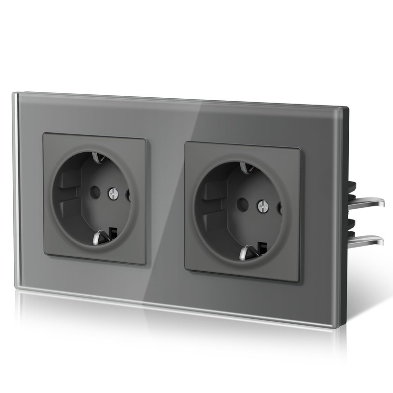 BSEED Schuko Socket Double EU Standard Single Wall Socket Crystal Glass Plate 16 Amp 250 V Increased Touch Protection Easy Installation White 157 mm Grey