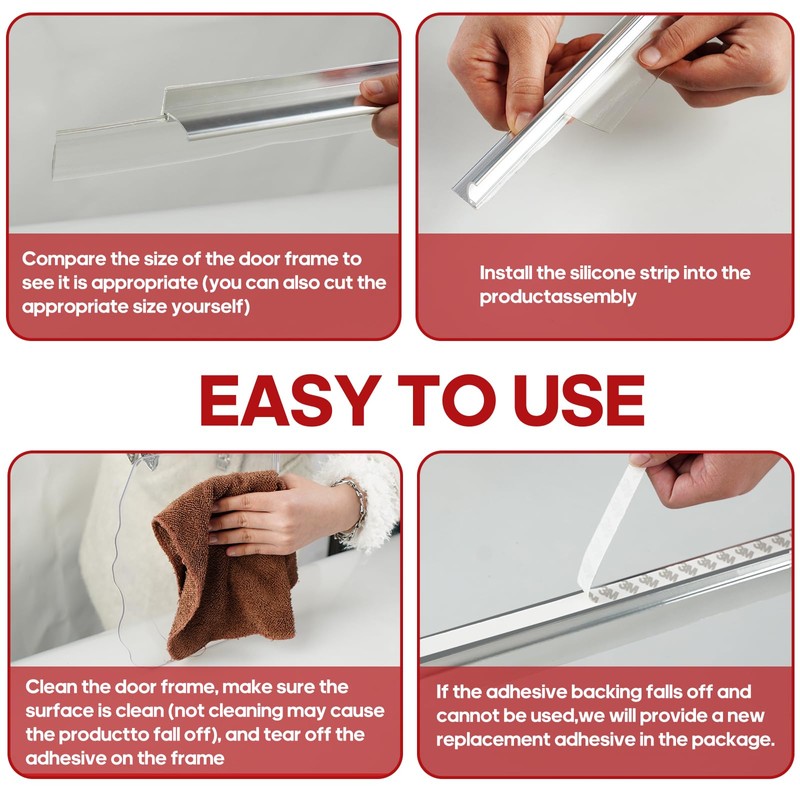 - Install with Confidence: we aim for a seamless installation process; Make sure to clean the bonding surface with alcohol before applying the shower door sweep to avoid the tape from falling off; If you find it difficult to insert the sweep into the aluminum track, a bit of soapy water can be used as a lubricant, ensuring a proper fit