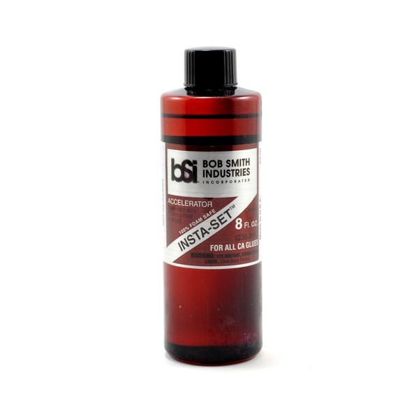 Insta-set is a catalyst which acts as an accelerator that allows caps to quickly cure in thick layers by enhancing the alkaline conditions during polymerization. Insta-set in a spray bottle is normally used to cure the ca that flows from joints when parts are pressed together. Applying an additional bead of thick ca along a seam and then curing it with insta-set significantly enhances a joints strength. For difficult to bond materials, insta-set can be applied to one surface and ca to the opposite surface. When brought together, they will bond instantly. Insta-set is formulated with a strawberry scent and activates ca in 6 to 8 seconds without any degrading of the caps strength, which can occur with many other accelerators. It is compatible with all surfaces, even clear plastic and white foam.