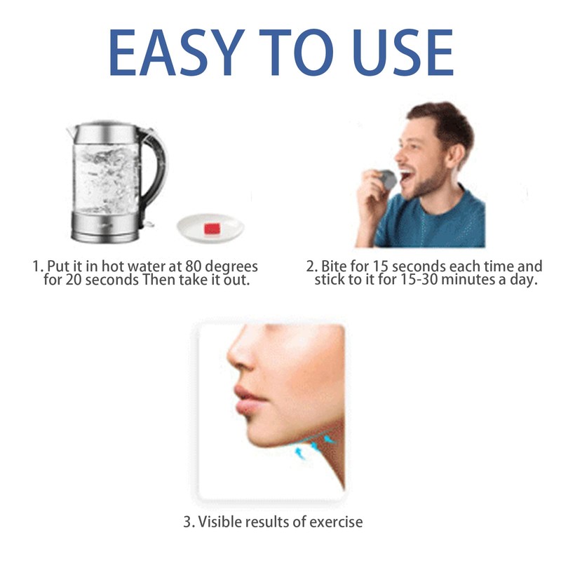 - 【Anwendungsvorschläge】Bodybuilding-Kieferknochen vor Gebrauch mit kochendem Wasser desinfizieren und nach dem Abkühlen in den Mund nehmen.Trainieren Sie dreimal täglich 10 Minuten lang und die Ergebnisse werden innerhalb von Wochen sichtbar. Sie verlieren Ihr gesamtes Kinnfett.