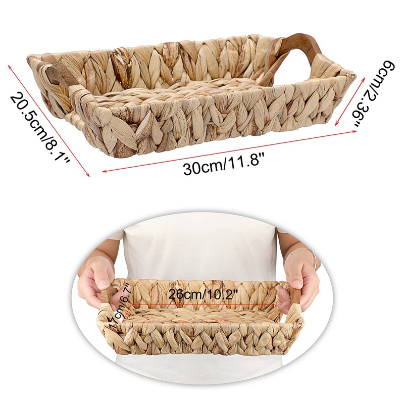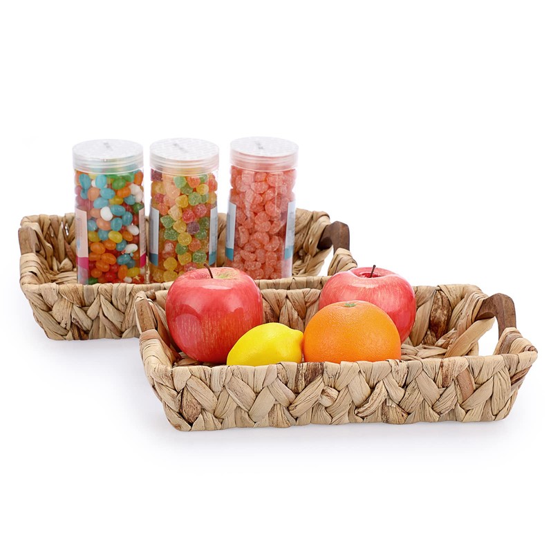 BSTKEY Set of 2 Water Hyacinth Storage Baskets Organizer, Natural Wicker Basket Holder with Wooden Handles, Rectangle Hand Woven Storage Basket (30x20CM)