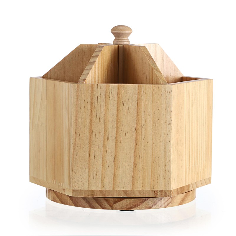 BSTKEY Wood Rotating Kitchen Utensil Holder, Countertop Kitchen Tableware Storage Organizer Cooking Tool Holder with Multiple Compartments and Removable Divider