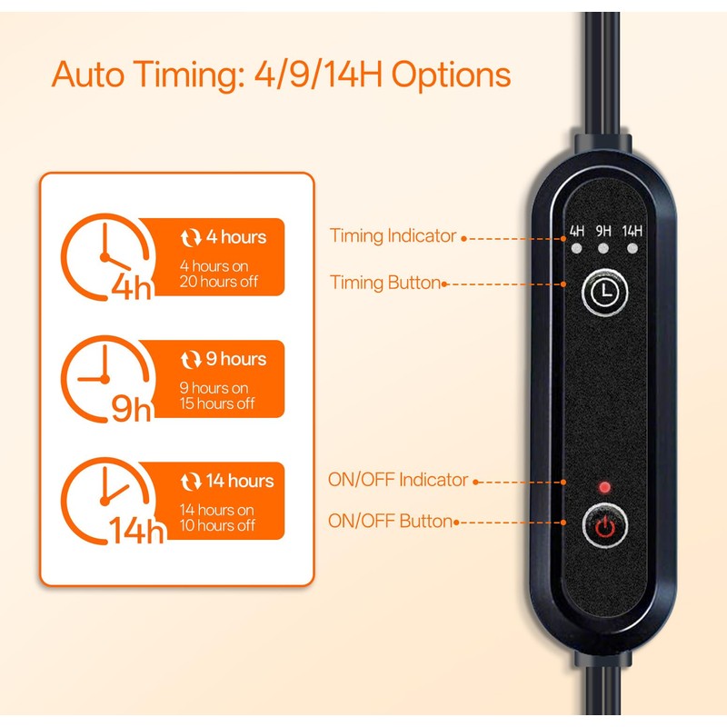 - Smart Auto Timer with 4/9/14H Cycles - Say goodbye to manual switching! This plant light features an intelligent timer that automatically cycles through 4, 9, or 14-hour lighting schedules. This hassle-free function ensures your plants get consistent, optimal light without you needing to remember to turn it on/off