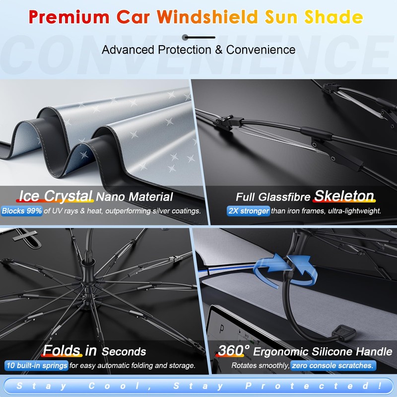 - Stay Cool and Comfortable: The Hyundai Palisade windshield sun shade umbrella effectively blocks and reflects heat to keep your Palisade’s interior significantly cooler. No more burning hot steering wheels or scorching seats. Ideal for hot climates like Arizona, Nevada, and Florida — enjoy a sweat-free, comfortable ride every time