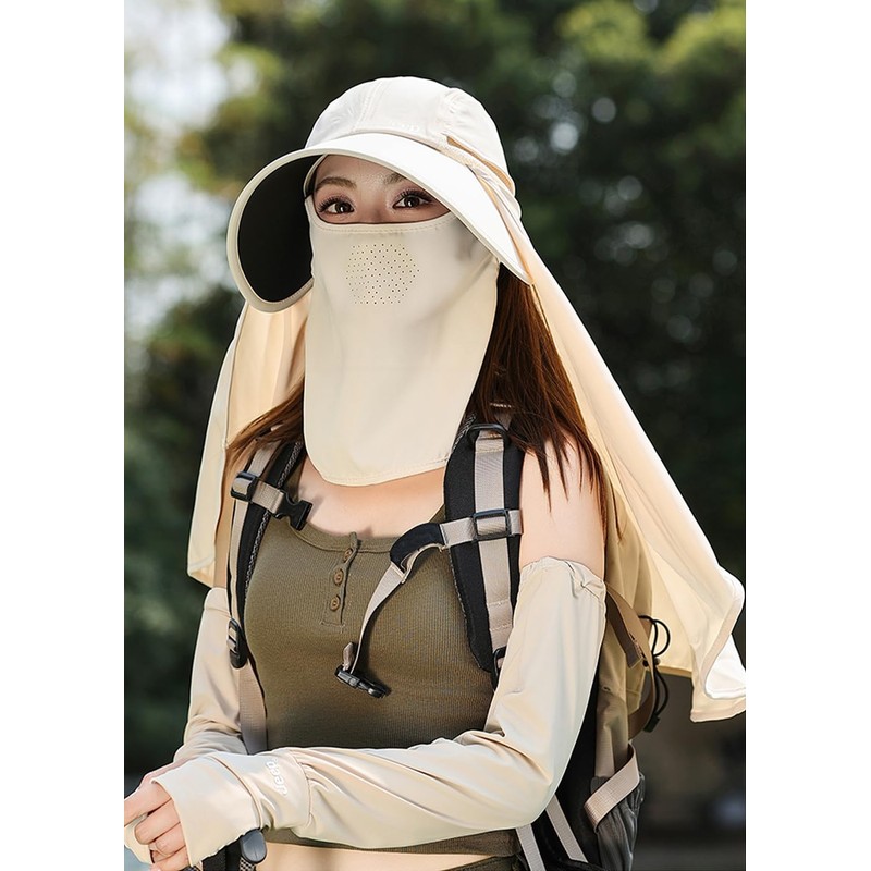 This women's sun hat offers all-around protection with a large brim, neck flap, and face mask. Perfect for keeping you safe from harmful UV rays during outdoor activities like hiking, gardening, and beach trips.
