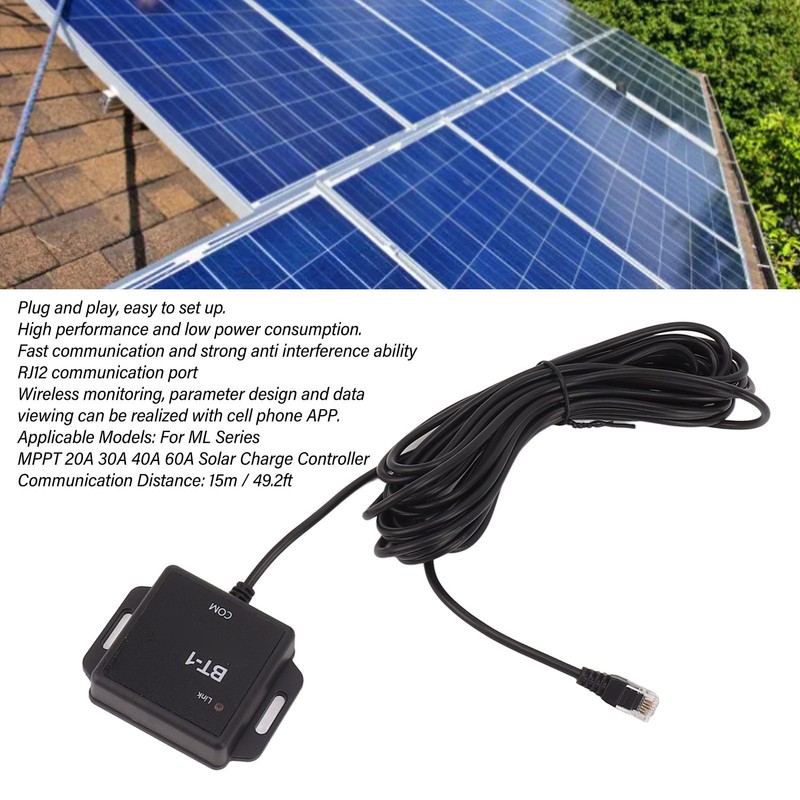 1、FUNCTION: BT module can be used with cell phone APP to realize the functions of wireless monitoring, parameter design and data viewing, with simple settings. 2、HIGH PERFORMANCE AND LOW POWER CONSUMPTION: Adopting high performance and low power BT special chip to bring you a good using experience. 3、ADVANCED TECHNOLOGY: This BT module adopts the latest BT technology and BLE technology, featuring fast communication and strong anti interference ability. 4、POWER SUPPLY: This BT module does not need to use external power supply, power supply directly from the RJ12 communication port power supply, very convenient. 5、COMMUNICATION DISTANCE AND APPLICABLE MODELS: The communication distance of this BT module is up to 15 meters. And this BT module is suitable for ML series MPPT 20A 30A 40A 60A solar charge controller.