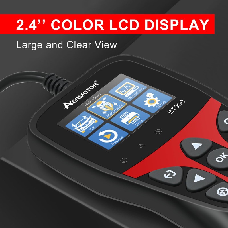 - 【2.4'' Color LCD Screen and Great Customer Service】BT900 battery load tester is equipped with a 2.4'' color LCD screen, which is eye-friendly and easy to read. If you have any questions about our product, please contact us any time, and we will try our best to solve the problem for you