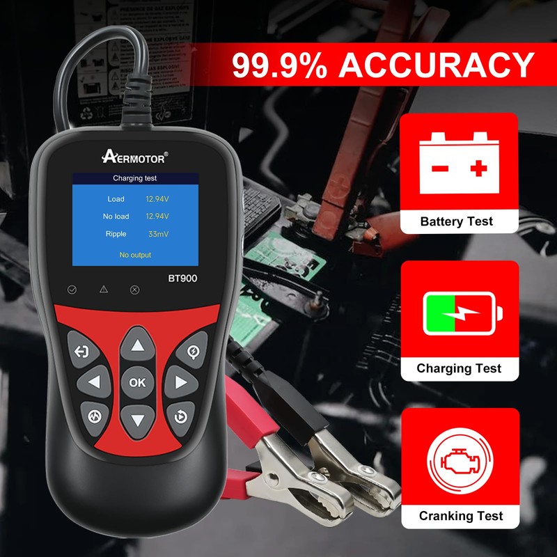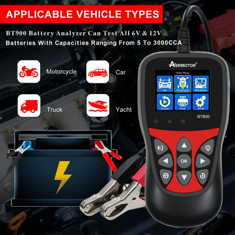 - 【Automotive Car Battery Tester】The BT900 car battery tester can test all 6V 12V 5-3000CCA lead-acid batteries including regular flooded, AGM flat plate, AGM spiral, or GEL batteries. Suitable for cars, motorcycles, trucks, RVs, ATVs, SUVs, boats, yachts, mowers and golf carts. It has a battery test, cranking test, and charging test, provides an overall analysis of batteries’ health, and helps you know their status in advance before they die