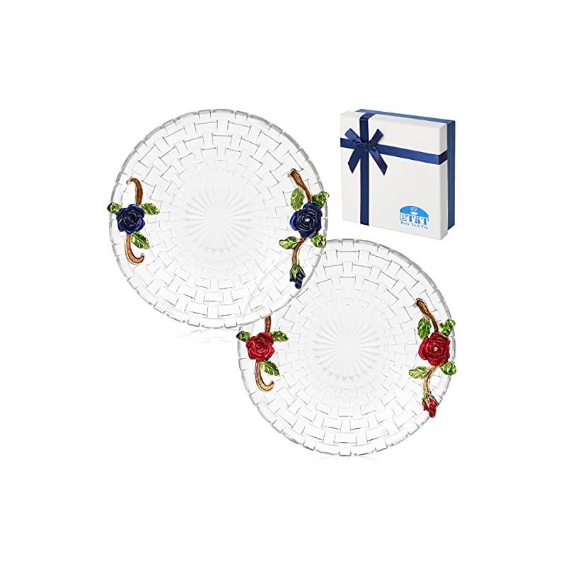 BTaT- Dessert Plates, 6 Inch, Set of 2, Glass Dessert Plates with Blue and Red Flowers and Gift Box, Round Glass Plate, Glass Dessert Plates, Glass Saucer, Glass Round Plate, Dessert Saucer