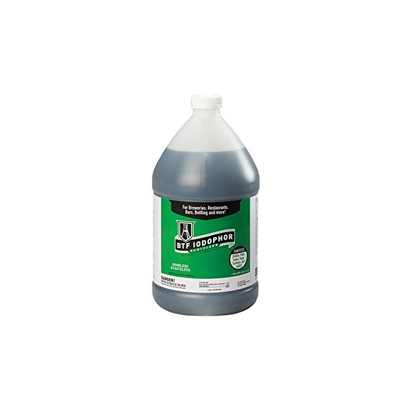 Safe to use on all your brewing equipment: buckets, kegs, tanks, vats, bottles and more. Low-foaming formula is superior to other brands of Iodophor for brewing. No-rinse concentrate requires only 1 tsp per 1 1/2 gallons of cool water and 2 minutes of contact time to be effective. BTF Iodophor for professional or home brewing and wine making Low foaming, no rinse sanitizer No residual taste or odor left behind Gentle on hands OMRI Listed (Organic Materials Review Institute)Directions for 12.5 PPM Brewing Sanitizer Solution: Mix 1 tsp BTF Iodophor into 1 ½ gallons cool water Mix ¼ oz (1/2 Tablespoon) BTF Iodophor into 2 ½ gallons cool water Mix ½ oz (1 Tablespoon) BTF Iodophor into 5 gallons cool water Allow solution to contact surface for 2 minutes, then air dry.