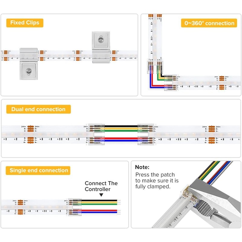 - Einfach zu installieren. Einfach zu bedienen. Kein L?ten erforderlich. Stecken Sie die abgeschnittenen Streifen und die zu verwendenden Dr?hte in der richtigen Reihenfolge in die durchsichtigen Steckverbinder, befestigen Sie die Metalllaschen mit einer Zange fest an den durchsichtigen Steckverbindern, um eine stabile Installation zu gew?hrleisten, und schlie?en Sie das Steuerger?t an die Stromversorgung an.