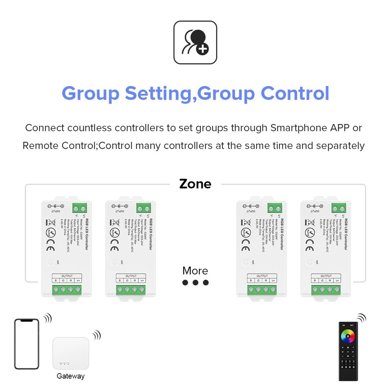 - 【Suitable For The Project】1.Multi zone control,Multiple controllers required. 2.Need 2.4GHz RF Remote or TuyaSmart SmartLife APP WiFi Control. 3. No need Bluetooth or WiFi . 4.Need Alexa or Google home third party voice control. 5.Cost effective LED project.