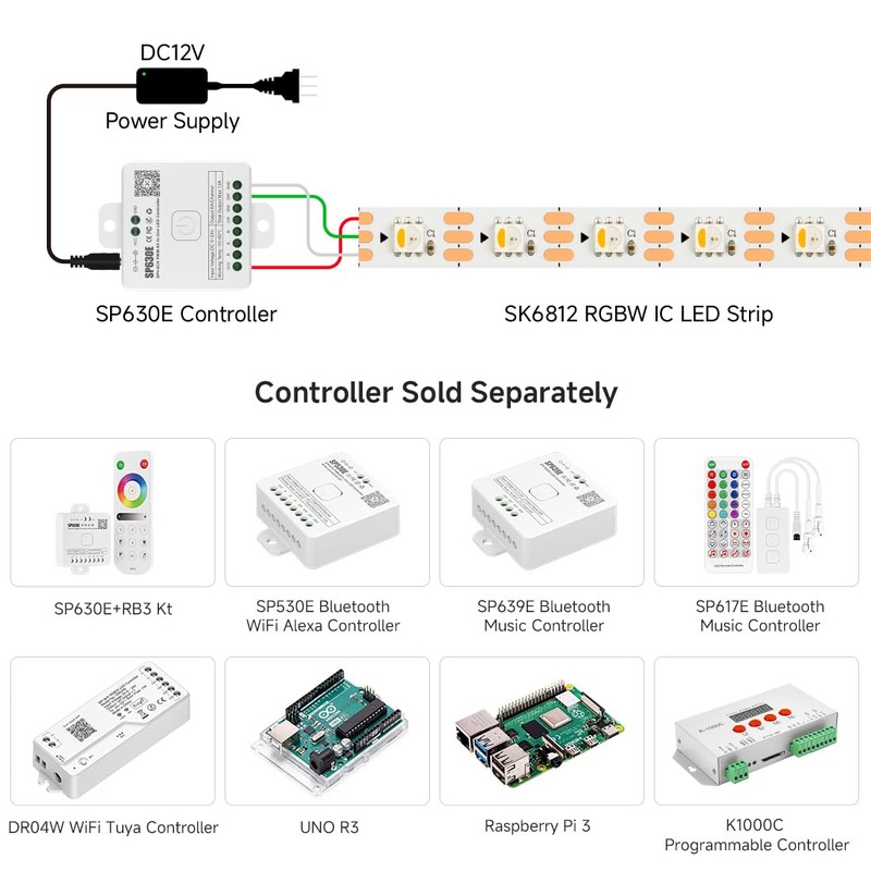 - Recommended controls and power supplies. Support SP617E(B09MTDHJX5), SP630E(B0BTYJQDNB), SP639E(B0BTZYHWJF), SP649E(B0BYRMN591), RC3(B0BTYJHB18), RB3(B0C1YQVPVP) and so on. R+G+B=Mixed White 0.3W/LED Pure white: 0.1W/LED.1 color(red or green or blue or pure white) 0.1W/LED. 2 colours (red + green) 0.2W/LED, 3 colours (red + green + blue = mixed white) 0.3W/LED. Recommended power supply: DC12V10A. The controller and power supply must be purchased separately.