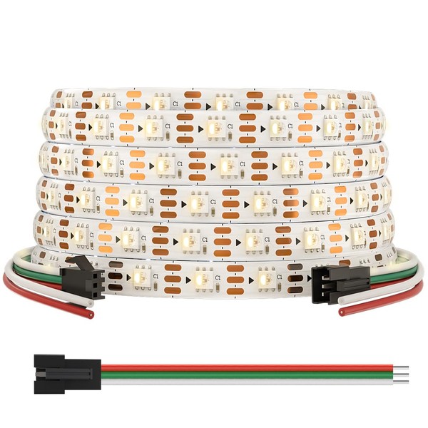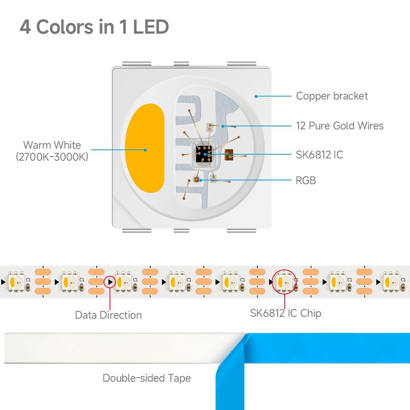 - 5050SMD SK6812 RGB+Warm White (3000K) Addressable LED Strip DC12V 5m 60LEDs/m 300LEDs 10mm White PCB IP65 Waterproof The SK6812 RGBW LED strip is the upgraded version of the WS2812B LED strip. R/G/B/W 4 colors in 1 LED. SK6812 has more color changing and color combination options with all the features of the WS2812B LED strip.