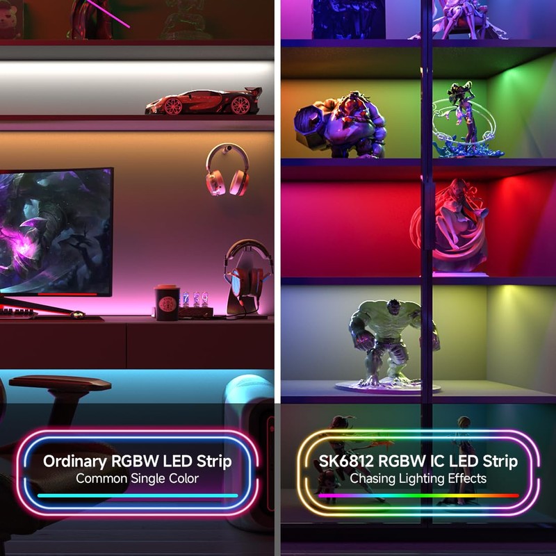- Individually addressable. Display with 256 brightness levels and 32-bit colour display. An IC controls an LED. You can control the LED individually and set it to any colour or animation you want. With the addressable RGBW controller, the strip can create hundreds of light effects such as colourful curtains, running water, raindrops, jump flashes, etc. You can also edit the animation effect with Coreldraw/Flash/LedEdit software.