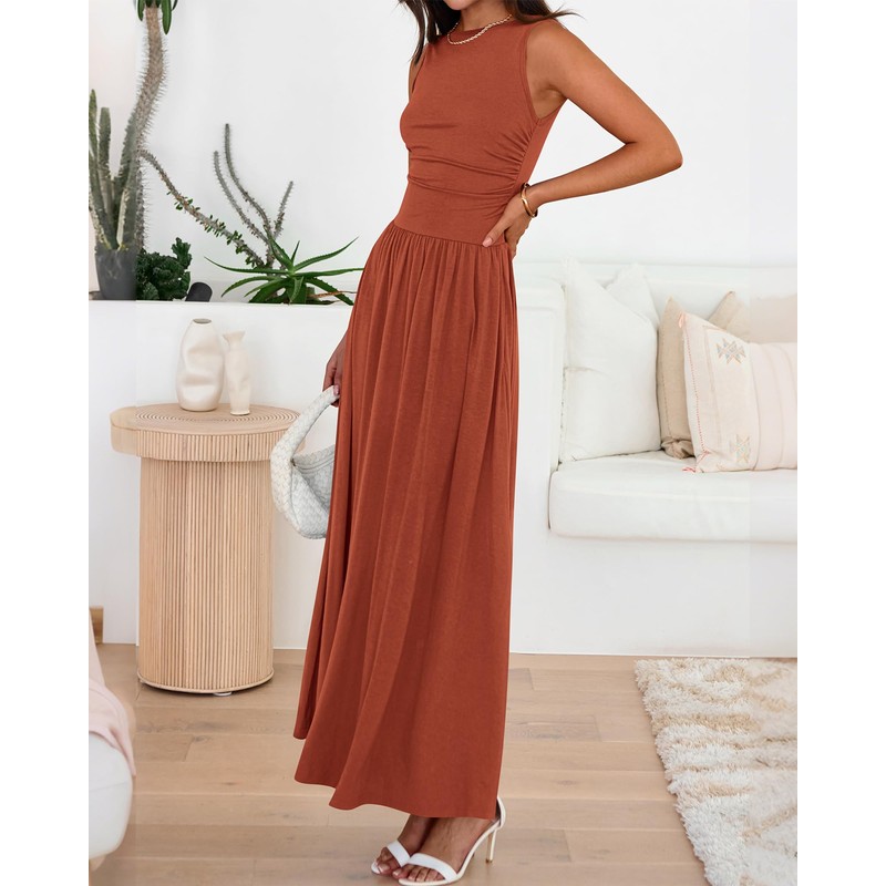 BTFBM Summer Maxi Dresses for Women 2025 Sleeveless Casual Ruched High Waisted Tank Long Sundress Flowy Beach Fall Dress(Brick Red, Medium)