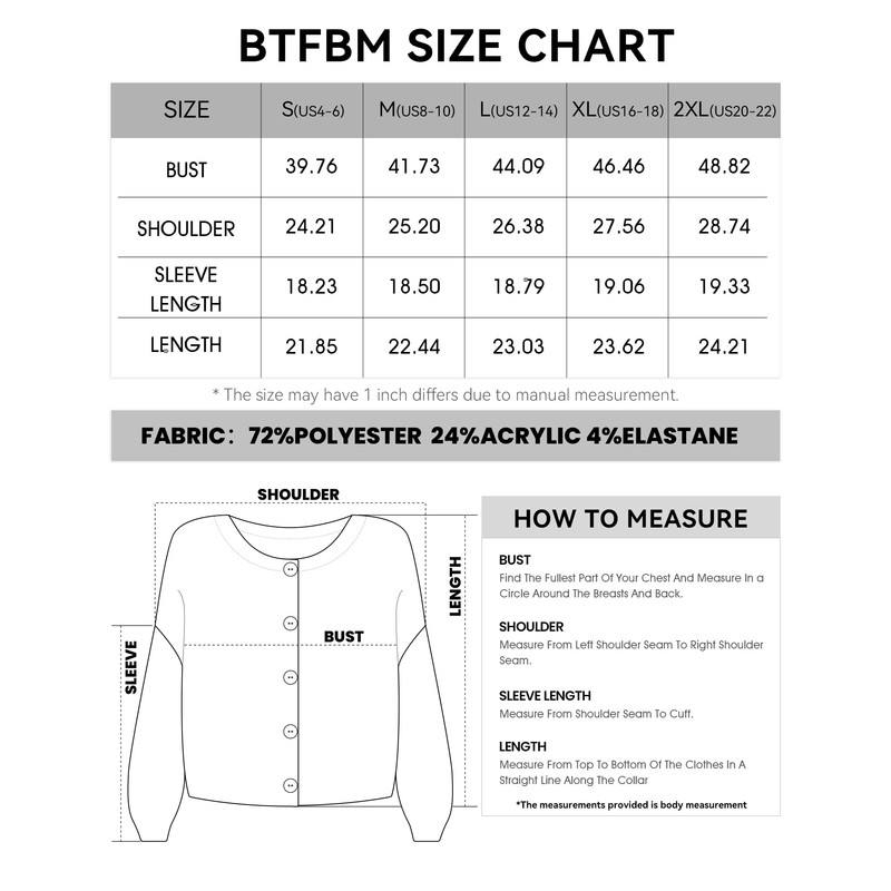 - FEATURES: S=US 4-6, M=US 8-10, L=US 12-14, XL=US 16-18, XXL=US 20 / Cropped Cardigan For Women / Lantern Long Sleeve / Button Down / Chunky Knit / Short Length