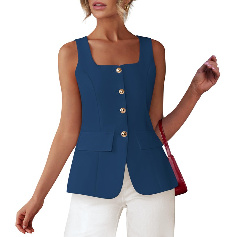 BTFBM Womens Sleeveless Suit Vests Dressy Casual Square Neck Business Work Waistcoat Summer Button Up Blazer Vest Tops(Dark Blue, Medium)
