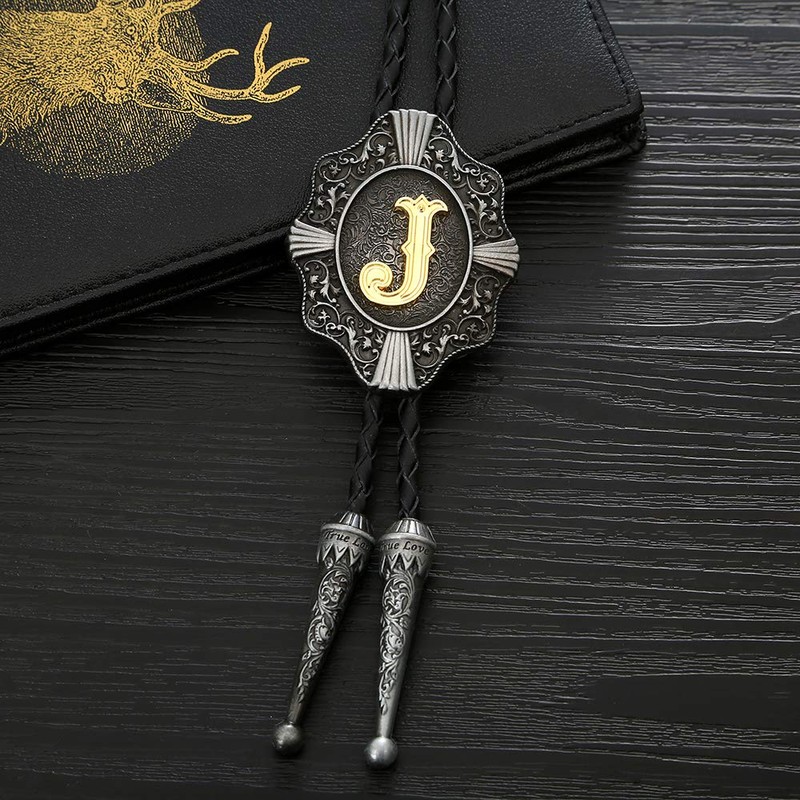 Btilasif Bolo Tie Western Cowboy Intial Letters Bolo Tie ABCDJMR to Z Leather Necktie Jewelry Accessories for Men Women,J