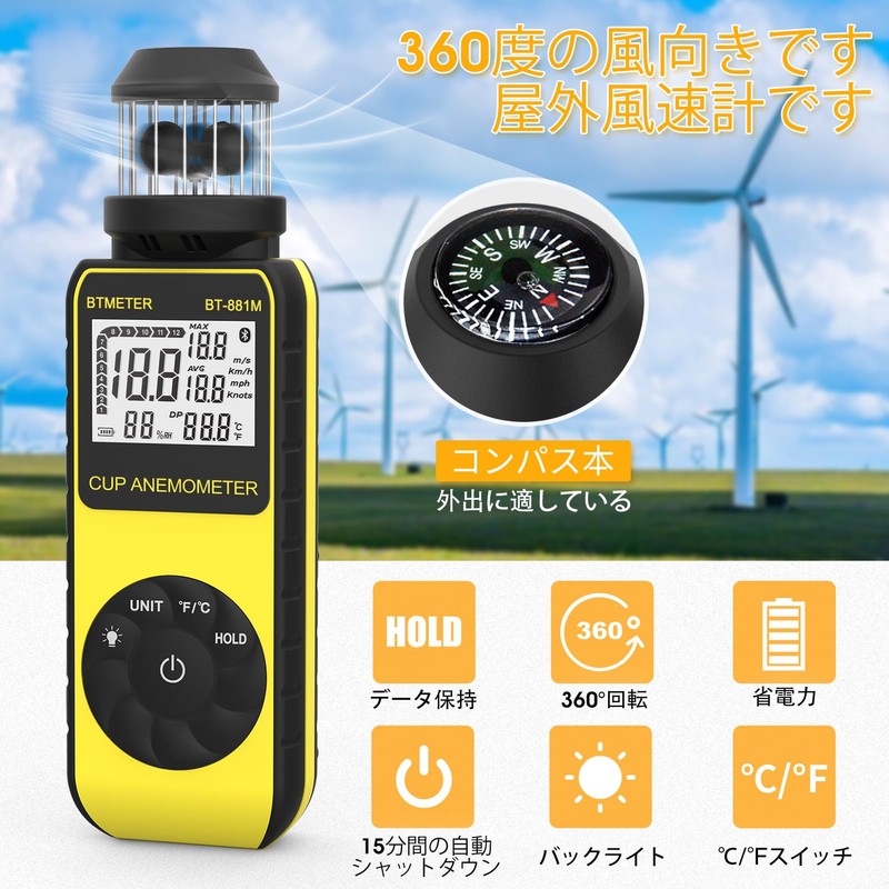 BTMETER BT-881M Air Anemometer Handy Air Anemometer Drone Wind Cup Anemometer with Direction, Digital Wind Temperature Measuring Wind Speed 5 Units of High Speed Wind Speed, Max/Average, Surging Flight - Japanese Manual