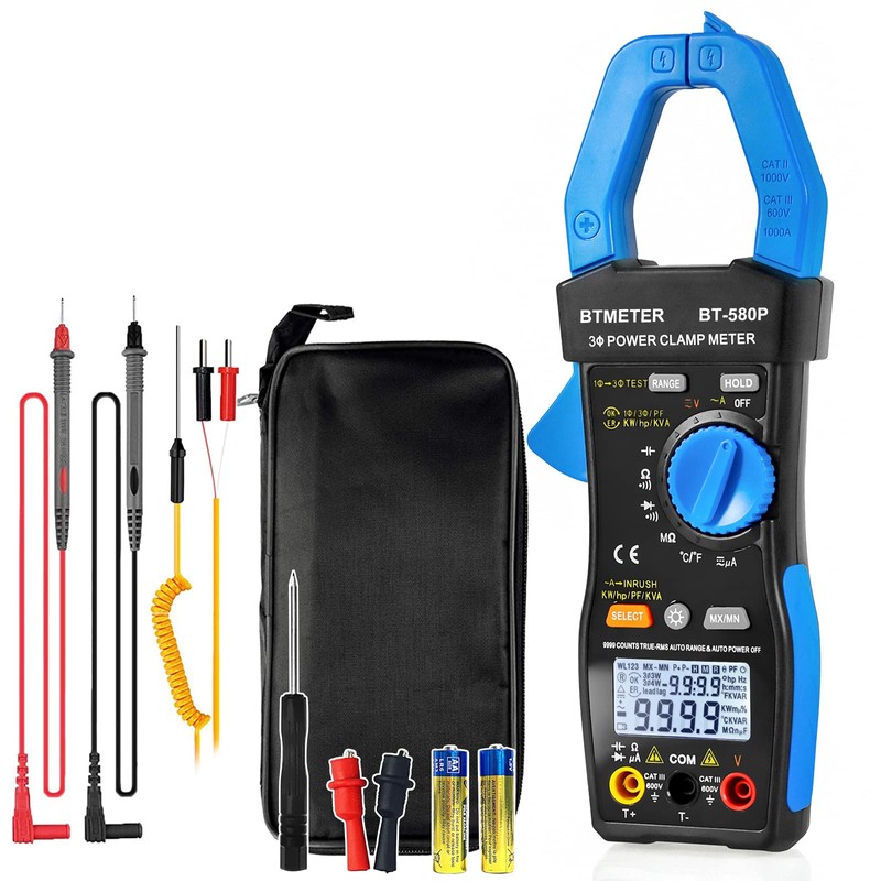 BTMETER Digital Clamp Meter TRMS 9999 Counts Inrush Multimeter Auto Rang Ammeter Voltmeter Continuity Tester Measure AC DC Volt Amp Ohm Diode Temp Power Factor Phase Angle Rotation (BT-580P)