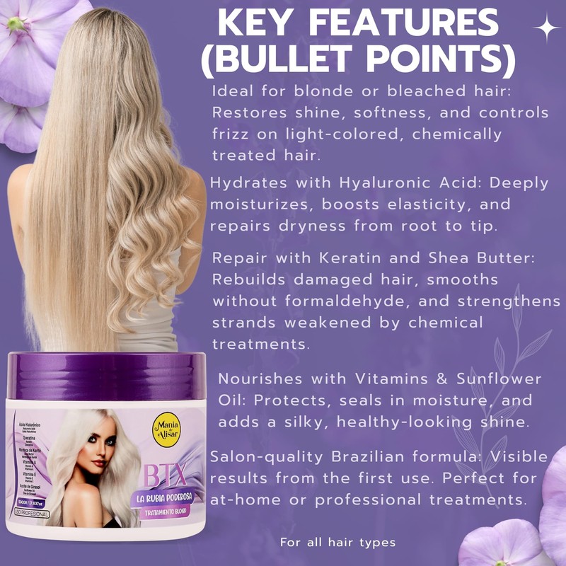BTox Hair Treatment Blond 500g / 17.63 oz – Mania de Alisar – With Hyaluronic Acid, Keratin, Shea Butter, Vitamins A & E, and Sunflower Oil – Hydration, Repair & Shine