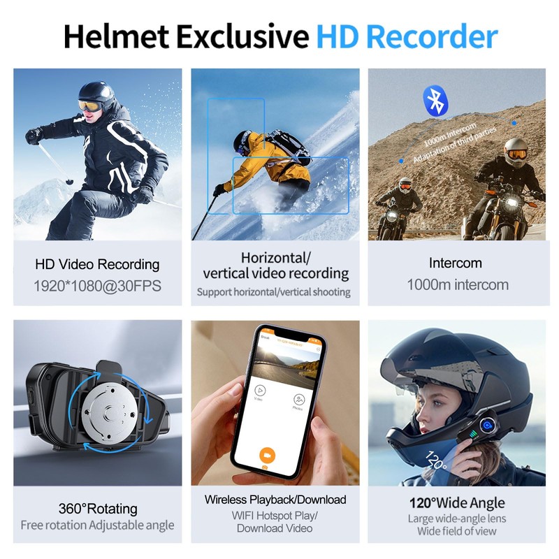 Motorcycle Helmet Bluetooth Headset, Wireless Camera Recorder with 1080P, 120°Wide Angle,HD Video/Photo, Body 360°Adjustment, Bluetooth 5.3, Smart Noise Reduction, IP66, 32GB TF Card