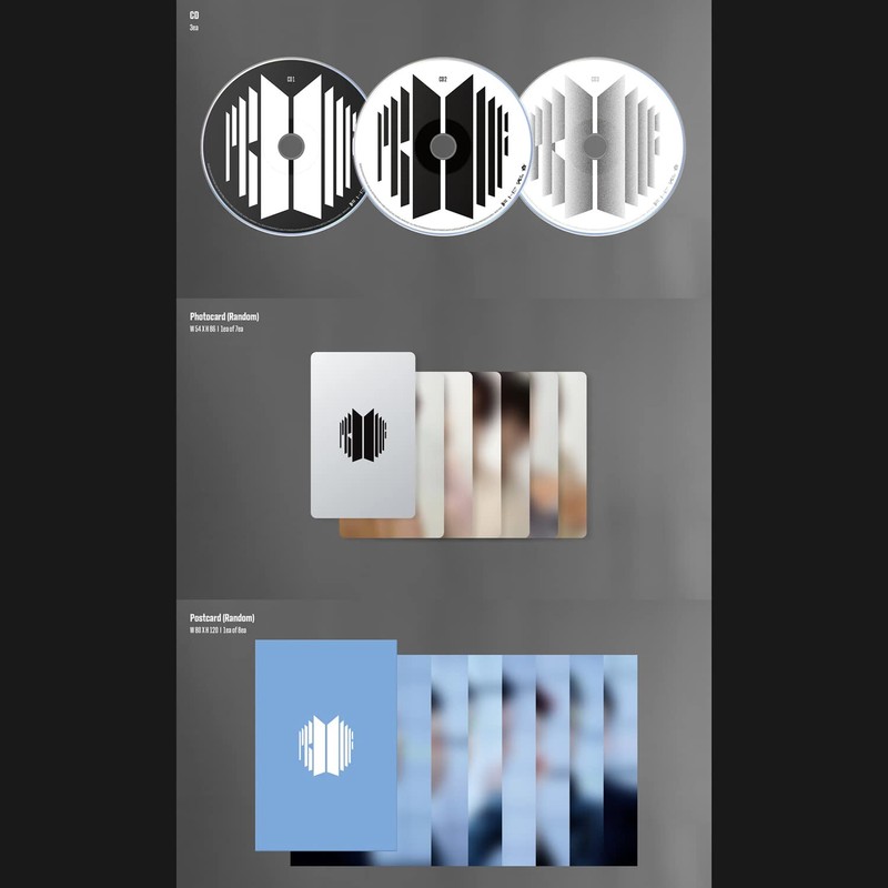 - BTS Proof Outer Sleeve + Booklet + CD Plate + CD + Photocard + Postcard + Mini Poster + Discography Guide + 2 Pin Button Badges + 10 Photos