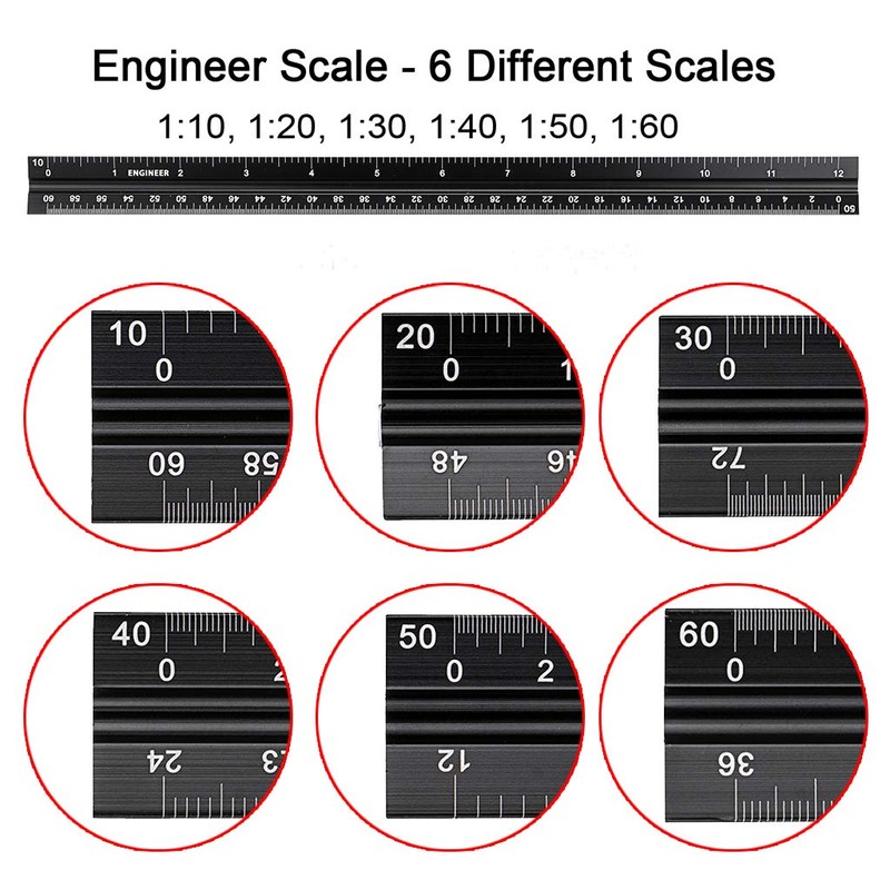 - High Visibility: Quick and easy to read. Sharp graduations and precise markings perform well on any blueprint or surface; Architect's 3 Sided Imperial Scales: 1-1/2", 1, 3/4", 3/8", 3/16", 3/32", 1/2", 1/4", 1/8", 3, 16; Engineer's 3 Sided Scale: 1:10, 1:20, 1:30, 1:40, 1:50, and 1:60; One 12 inch Black Stainless Steel Flexible Ruler imperial and metric scale.
