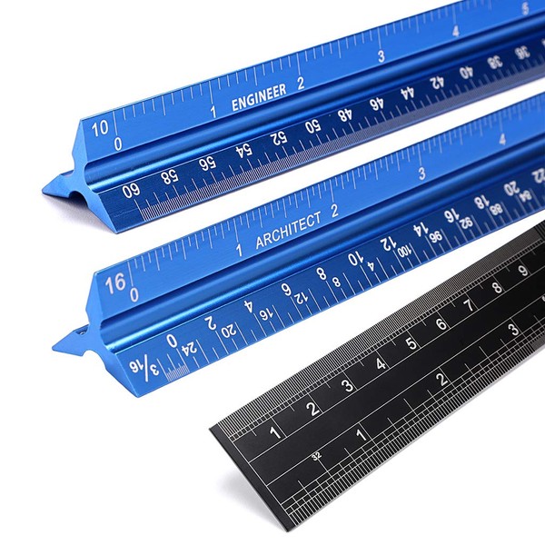 - High Visibility: Quick and easy to read. Sharp graduations and precise markings perform well on any blueprint or surface; Architect's 3 Sided Imperial Scales: 1-1/2", 1, 3/4", 3/8", 3/16", 3/32", 1/2", 1/4", 1/8", 3, 16; Engineer's 3 Sided Scale: 1:10, 1:20, 1:30, 1:40, 1:50, and 1:60; One 12 inch Black Stainless Steel Flexible Ruler-imperial and metric scale.