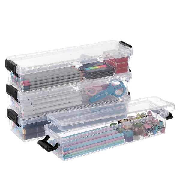 BTSKY 4 Pack Clear Storage Containers Pencil Boxes - Multi-functional Home/Office Rectangle Plastic Stationery Boxes, Stackable Transparent Utility Boxes Organizer, Black Button