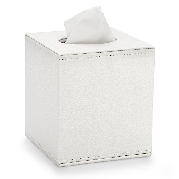 BTSKY PU Leather Cube Tissue Holder Box - Household/Office Square Tissue Box Cover, Textured Tissue Paper Box Case Napkin Holder, White