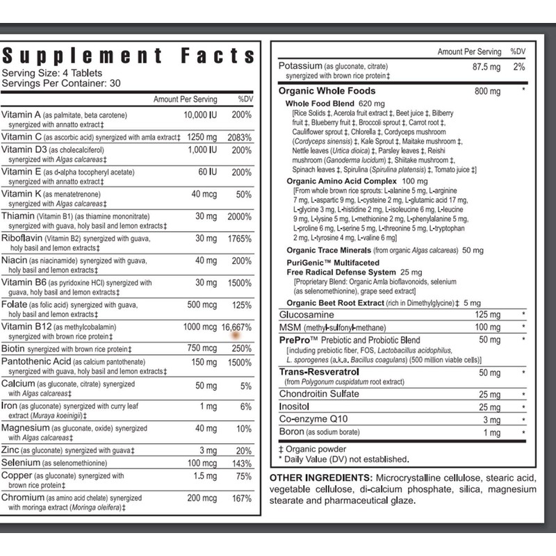 - Vitamin A, Vitamin C, Vitamin D3, Vitamin E, Vitamin K, Thiamin, Riboflavin, Niacin, Vitamin B6, Folate, Vitamin B12, Pantothenic Acid, Calcium, Iron, Magnesium, Zinc, Selenium, Copper, Chromium, Potassium, Organic Whole Foods [Whole Food Blend (Rice Solids, Acerola fruit extract, Beet Juice, Bilberry fruit, Blueberry fruit, Broccoli sprout, Carrot root, Cauliflower sprout, Chlorella, Cordyceps mushroom, Kale Sprout, Maitake mushroom, Nettle leaves, Parsley leaves, Reishi Mushroom, Shiitake Mus