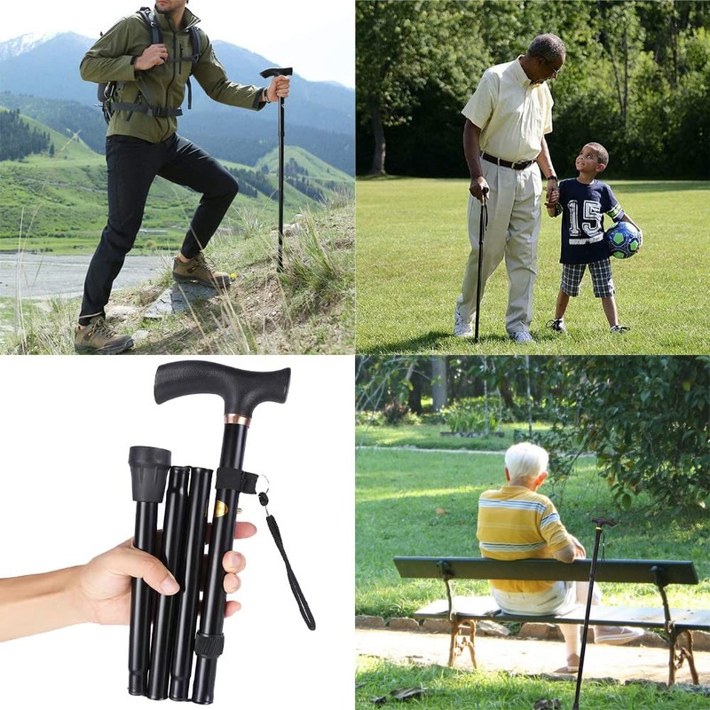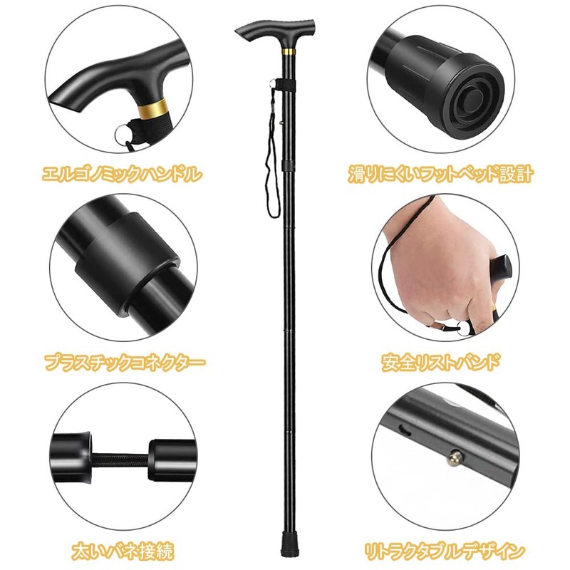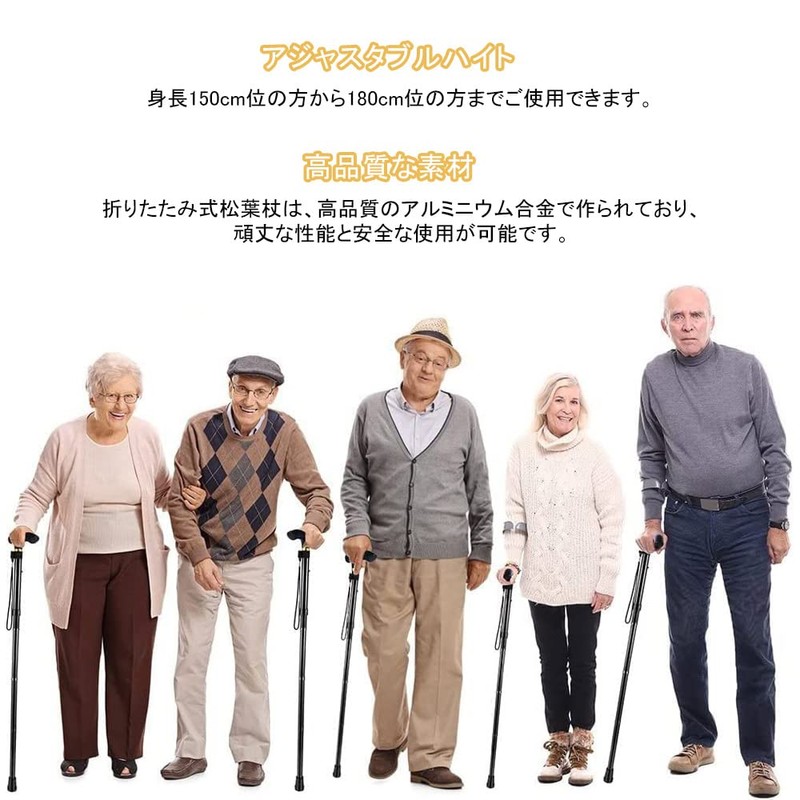 - 【折り畳み式】持ち運びに便利な折り畳み式の杖です。コンパクトに4つ折りで畳むことができ、収納にも場所を取りません。使うときは支柱内の二重ゴムが組み立てを補助するため、力をほとんど使わなくても誰でも瞬時に組み立てることができます。使わないときは付属の収納袋に入れてバッグの中に、楽に持ち運びが可能です。