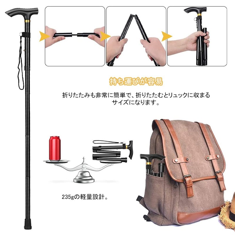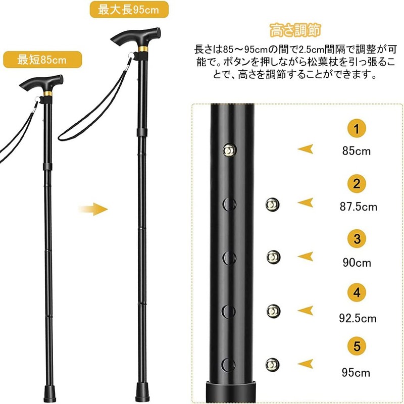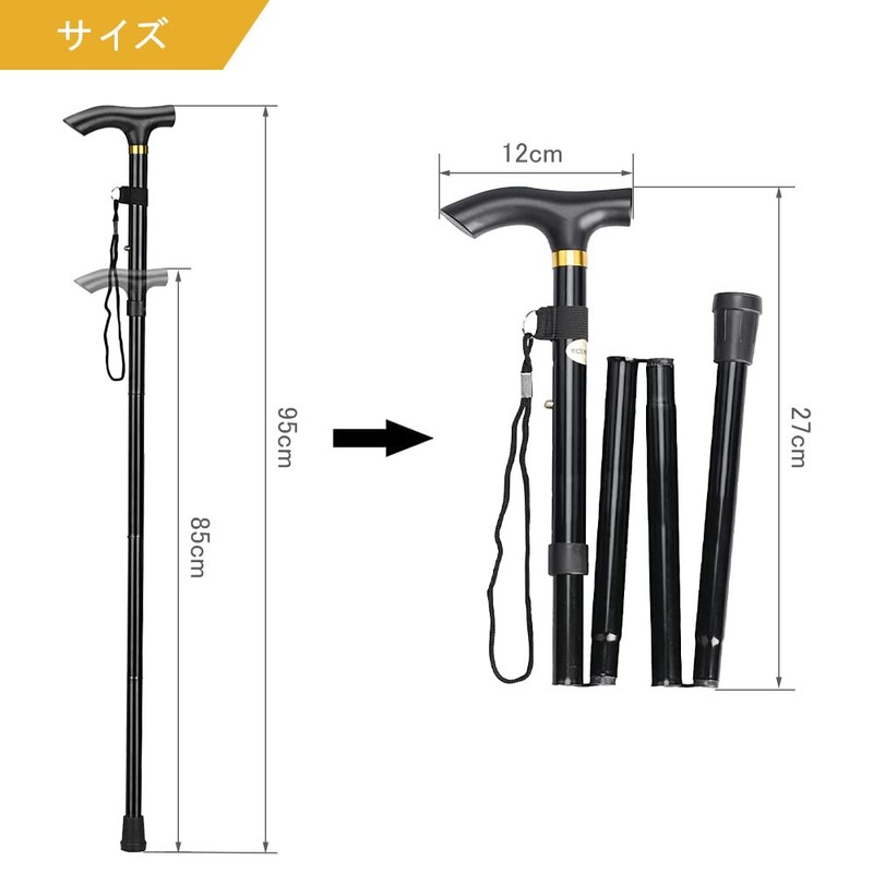 - 【サイズ】折りたたみ杖の調整範囲:85cm-95cm。折りたたみ:約27cm。ハンドル長さ:12cm。シフト間隔距離:2.5cm(5段式調整)。重量:約235g。