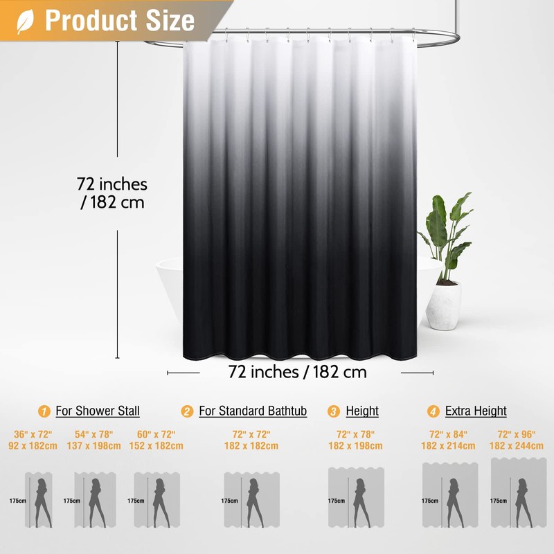 - đăStandard Sizeă: 72" W x 72" L; 180GSM (Gram Per Square Meter), about 0.8 pounds heavier than normal 100GSM fabric shower curtains; Each Shower Curtain Set includes 1 black ombre shower curtain and â 12 Plastic Hooksâ . 12 Metal grommet holes promote easier hanging and long-lasting strength. Suitable for most standard sized bathrooms and easy to install.