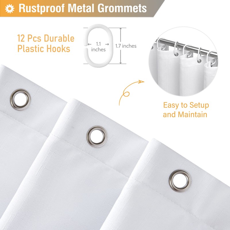 - đăPremium Quality Linen Textured Shower Curtaină: This simple shower curtain is made of 100% premium polyester fabric, which is wrinkle-resistant and non-fading. Features an advanced slub weave with subtle embossing and cross-thread texture. This modern fabric shower curtain is perfect for apartment, hotel, spa, camper, RV, dorm, school shower, gazebo, athletic club, gym and everywhere else you need a shower curtain.
