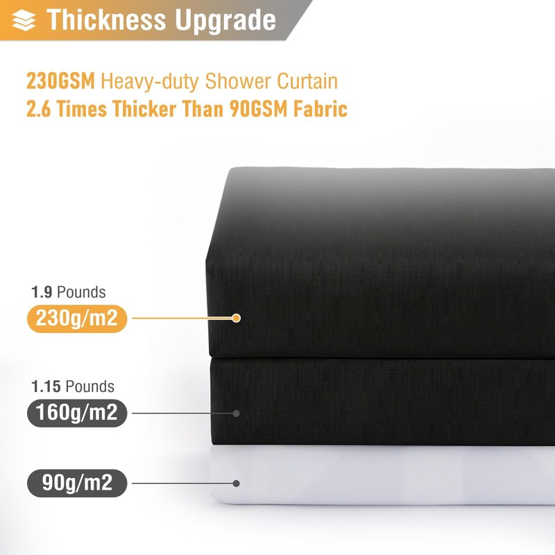 - 🛁【Standard Size】- W72”×H72”/(183cmx183cm). 12 rust-proof metal grommets (to prevent tears) that fit most standard shower hooks or rings. Package includes 1 black Shower Curtain and 12 Plastic Hooks(Convenient to install).