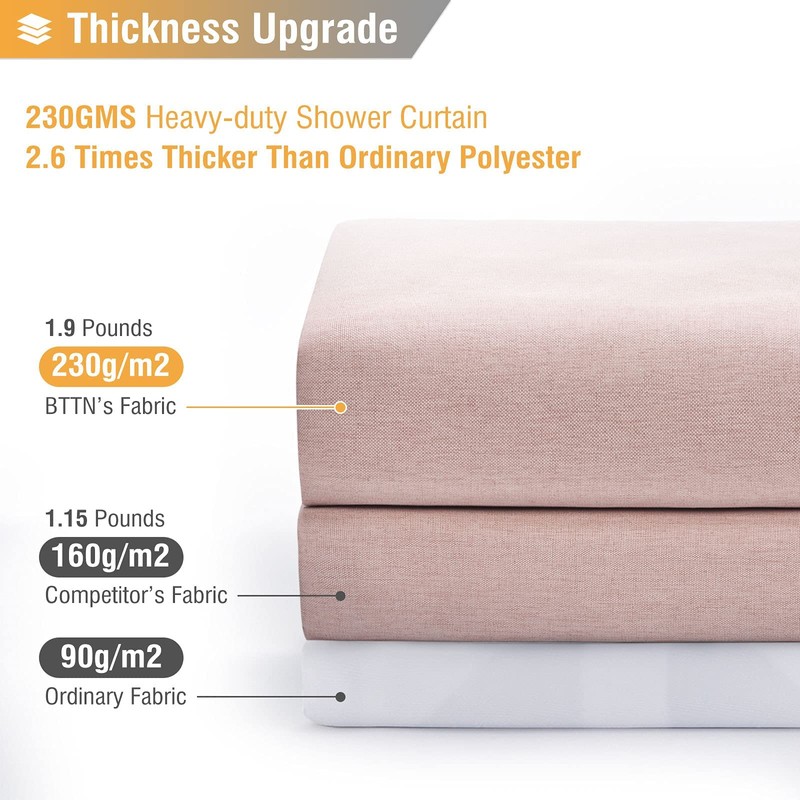 - 🛁【Premium Quality】- Using advanced two-color yarn parallel weave, 2.6 times denser than the traditional weave. The high-density weave and heavy duty polyester fabric provide maximum protection for your privacy. The simple and aesthetic solid color style instantly enhances your bathroom taste and allows you to enjoy a luxurious hotel bath at home