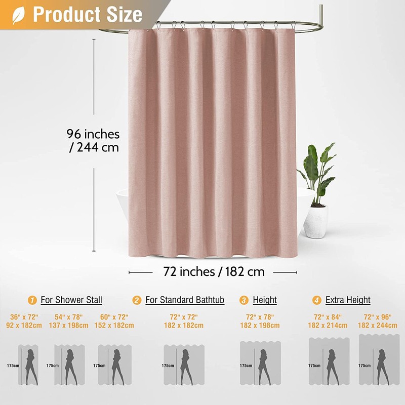 - 🛁【Extra Long Size Shower Curtain】- W72’’ x H96’’. 12 rust-proof metal grommets (to prevent tears) that fit most standard shower hooks or rings. Package includes 1 Blush pink Shower Curtain and 12 Plastic Hooks(Convenient to install)