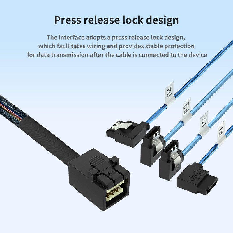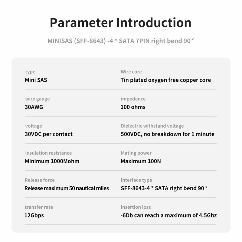 - "90° Right-Angle Design Saves Space", Engineered with a compact right-angled SFF-8643 connector to reduce cable strain and fit tightly packed server racks or chassis.