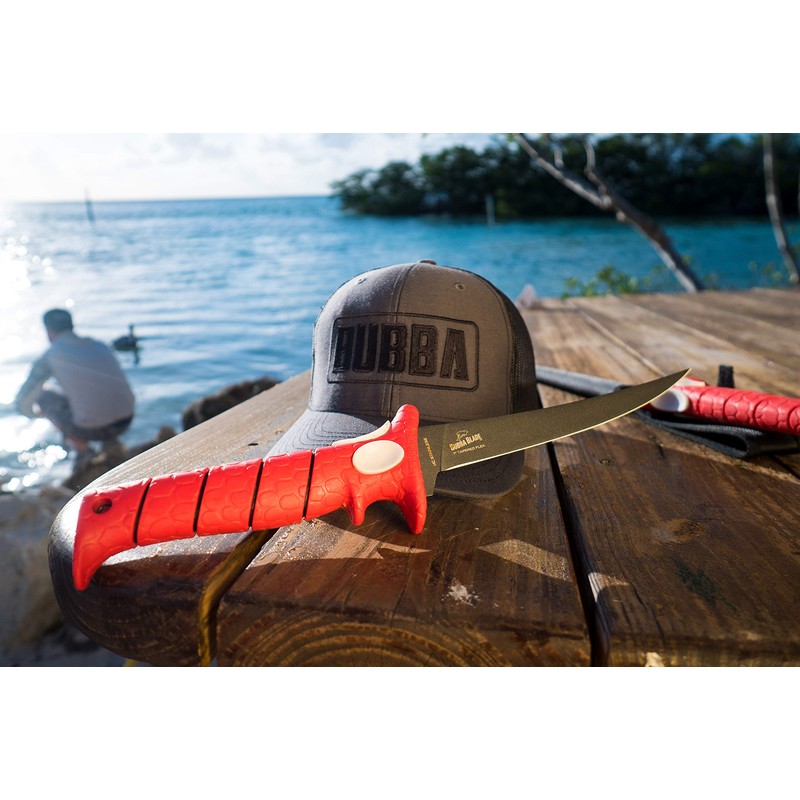 Bubba 9 Inch Tapered Flex Fillet Knife with Non-Slip Grip Handle, Full Tang High Carbon Stainless Steel Titanium Coated Non-Stick Blade, Lanyard Hole and Synthetic Sheath for Fishing