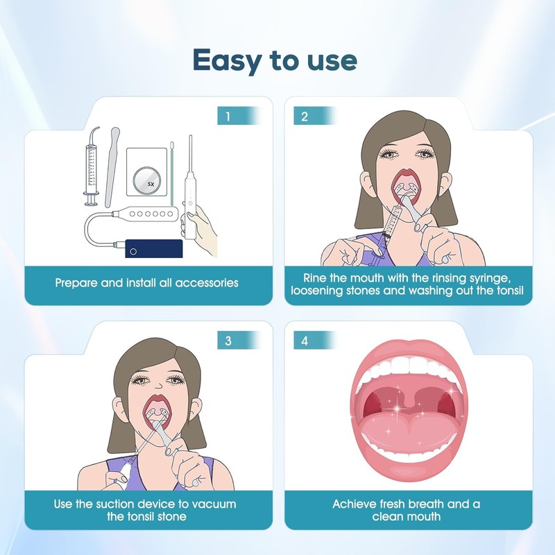 - Electric Tonsil Stone Removal Kit - Do you suffer from oral problems such as bad breath, stones, difficulty swallowing, etc.? Now your nemesis is here! This tonsil stone remover is equipped with a syringe, tongue depressor, 5x magnifying glass, etc. It has complete accessories and is easy to use. It can be operated by one person and the effect is beyond your imagination