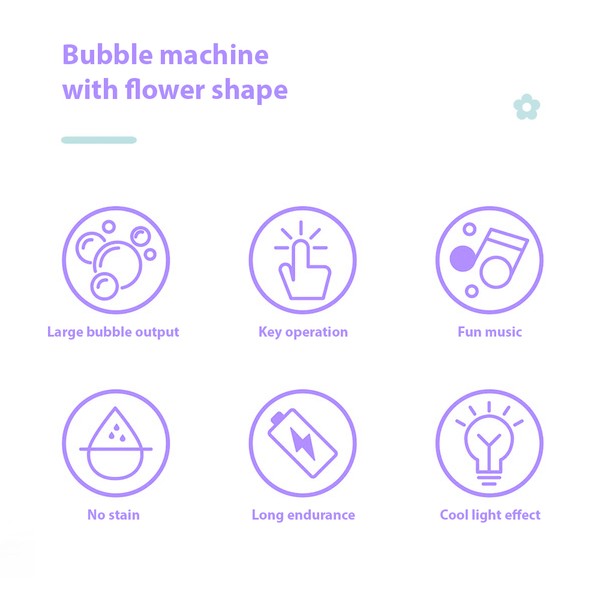 1、【Unique Sunflower Design】: This automatic bubble machine is designed in a unique and adorable sunflower shape, adding a touch of fun and creativity to your party or outdoor activities. It\u0027s not just a bubble machine, but also a cute decoration. 2、【Colorful Breathing Light】: Equipped with a dazzling colorful breathing light, this bubble machine can create a cool and dreamy atmosphere, especially at night. It\u0027s perfect for birthday parties, weddings, and other special occasions. 3、【360° Leakproof Design】: Thanks to its sealed design, this bubble machine can be flipped 360 degrees without leaking any bubble liquid. This ensures a clean and mess-free playtime, allowing to enjoy the fun of bubbles to the fullest.