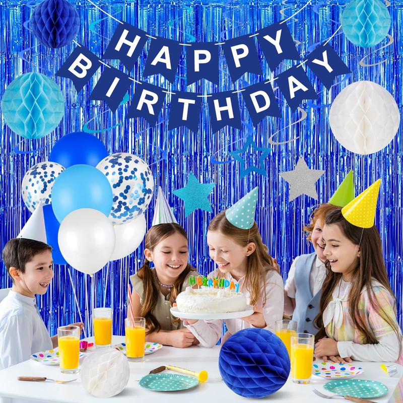 - Party decorations package: Our party decoration package includes a blue "Happy Birthday" banner, 10x 12 inch blue confetti latex balloons, 10 x 12 inch blue metallic balloons, 10x12 inch white latex balloons, 4x 12 inch light blue latex balloons, 8 sets of star hanging decorations, 6 pcs honeycomb balls, 2 pcs light blue rain curtain(1m*2m), Ideal birthday banners for girls, boys, and girls.