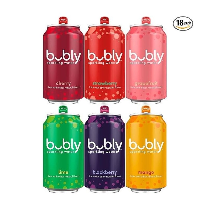 - Sparkling Water Pack: Includes 18 (12oz) cans of bubly Sparkling Water Seltzer Water: Blackberry, Lime, Cherry, Grapefruit, Strawberry, and Mango flavors"