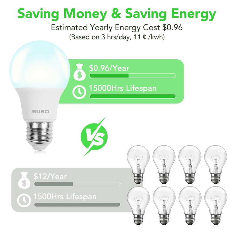 - Energy Efficient & Cost Saving:Save up to 85% on energy consumption with BUBO A19 LED 8W bulbs, equivalent to 60W incandescent bulbs. With an estimated annual energy cost of just $0.96 (based on 3 hours/day, 11/kWh), they help cut electricity bills significantly.
